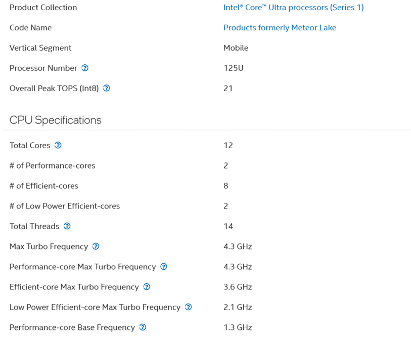 Intel Core Ultra 7 155H 4P Cores + 8E cores (12 Cores/ 16 Threads) 3.7-5GHz.